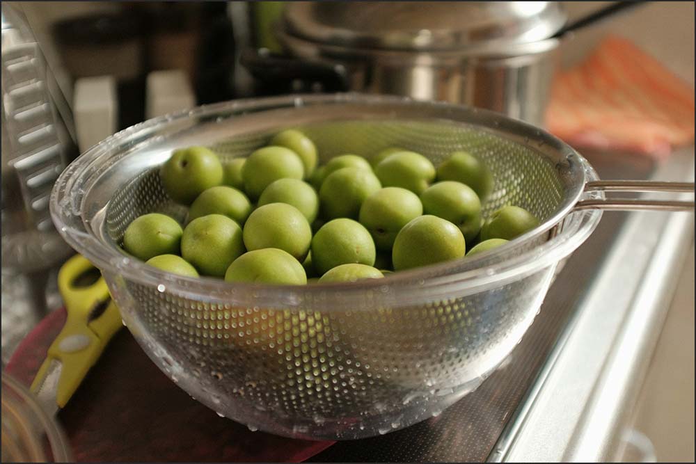 6월 초순에 수확한 단단한 청매실을 준비합니다. 상처나 흠이 없는 것을 선택하세요. - 세척 및 손질