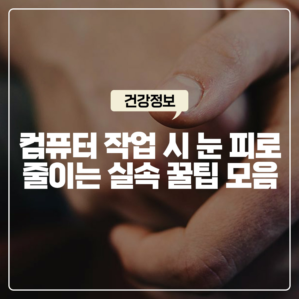 컴퓨터 앞에서 작업할 때 눈 깜빡임이 평균의 1/3 수준으로 줄어든다고 해요. 깜빡임은 눈 표면에 수분을 공급해 눈을 촉촉하게 유지하는 역할을 하므로 의식적으로 눈을 자주 깜빡이는 습관이 필요합니다.